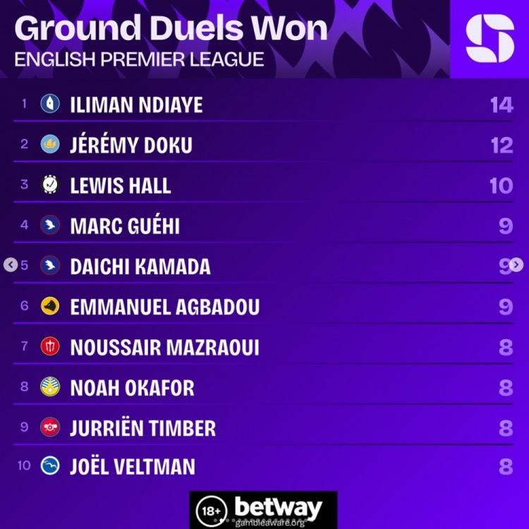 9月24日讯 英超第5轮战罢,squawkafootball列各项数据排行,苏超直播埃弗顿翼锋恩迪亚耶是赢得地面对峙 最多的球员,共计14次。