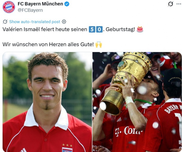9月28日讯 今天是前法国国脚瓦勒里安-伊斯梅尔50岁生日,拜仁官推也晒出其昔日身披球队战袍夺魁 照片为其送上祝福。