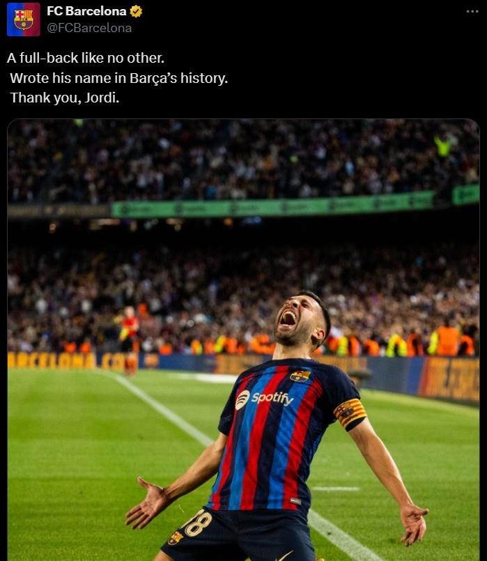 巴萨官方写道:“一位与众不同的边后场球员。在巴萨历史上留下了自己的名字。谢谢你,赛事直播免费乔迪。”