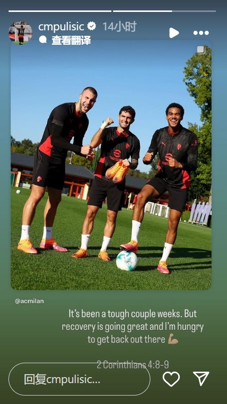 在本月的国际赛事 日,米兰球员普利西奇在为美国队出战时负伤 。昨天,米兰晒出普利西奇与帕夫洛维奇、奥多古的练习 照,普利西奇转发并配文:这几周很艰难,但我的复健 进展很好,苏超cctv5正在直播渴望重回赛场。