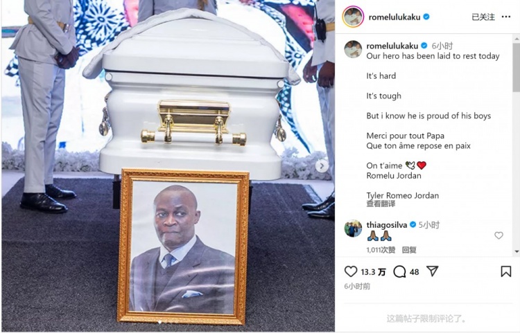 10月24日讯 卢卡库社媒发文,悼念离世的父亲。