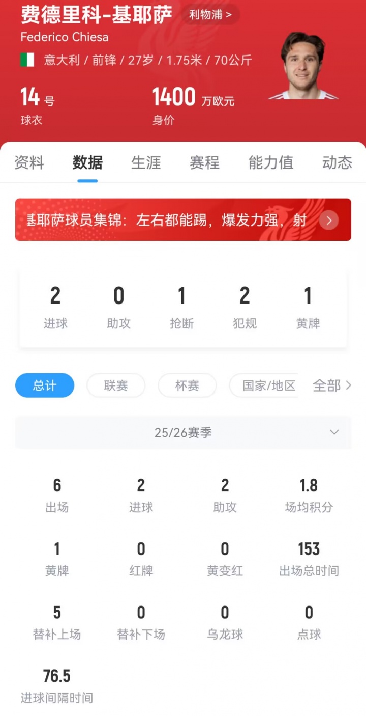 本赛季,基耶萨已经为利物浦在各项赛事中出场6次,贡献2球2助,目前的身价为1400万欧元。